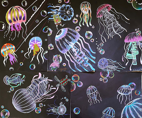 Cool thing is, our past assignment was hot air balloons that taught the students how to use contour lines on a ballooned form. The jellyfish are a perfect match for continuing the learning into a new subject.